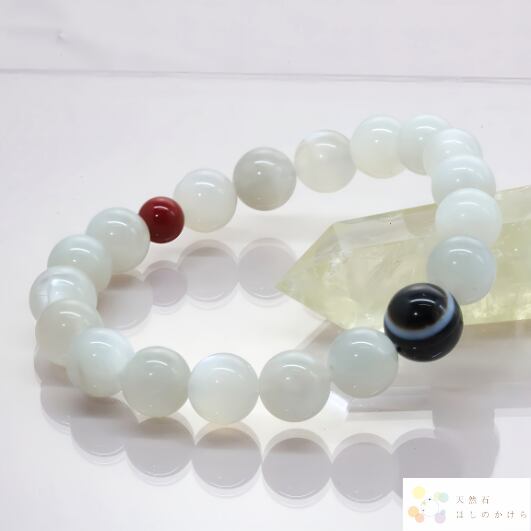 古来より、月は神秘的な力を宿すパワーストーンと言われ、持ち主の身に起こる様々な変化に対し、心身の調子を整え、リラックスさせる効果があるとされています。また、持ち主のマイナスエネルギーを浄化し、プラスのエネルギーに変える力を持つとも言われています。
