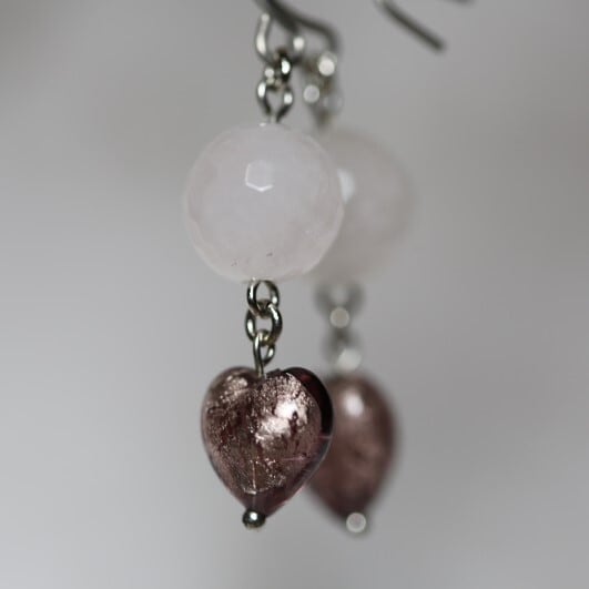 ハートのベネチアンビーズとローズクォーツのチタンピアス