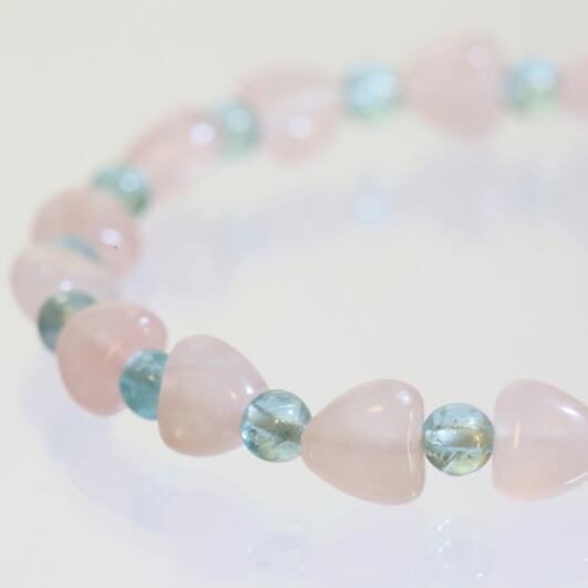 ハートのローズクォーツの間にアパタイトを入れる事で、可愛らしいリボンの形になったブレスレットです。
