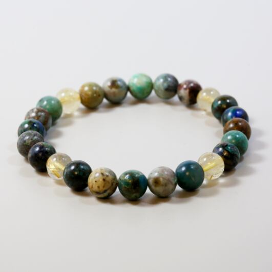 エネルギーが安定する四角形の位置にゴールドルチルクォーツを配置したクリソコラのブレスレット(686)【強力な財運・仕事運・ターニングポイント】