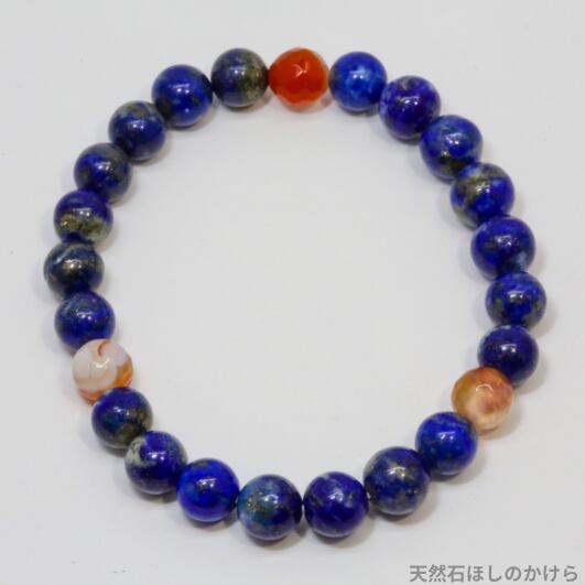 サードオニキスを三角形(トライアングル)の位置に配置し、ラピスラズリと合わせる事で、強力な魔除け効果を持ち、未知のチャレンジに挑む勇気や、新たな扉を開くための力が湧いてくるブレスレット。