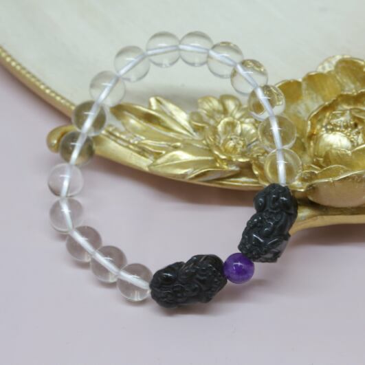 財運の神獣・貔貅(ひきゅう)を使った水晶とアメジストのブレスレット(761)【財運・真実を見抜く・浄化】